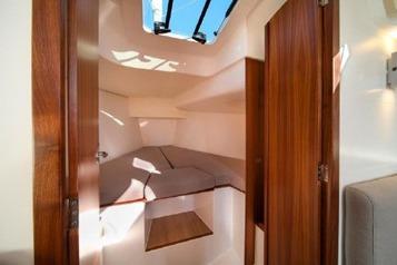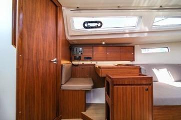 - Companionway with white laminate bulkhead finish for superior wear resistance, entrance steps with angled treads, handrails integrated with bulkheads, main engine access through a piston-supported hinging panel.