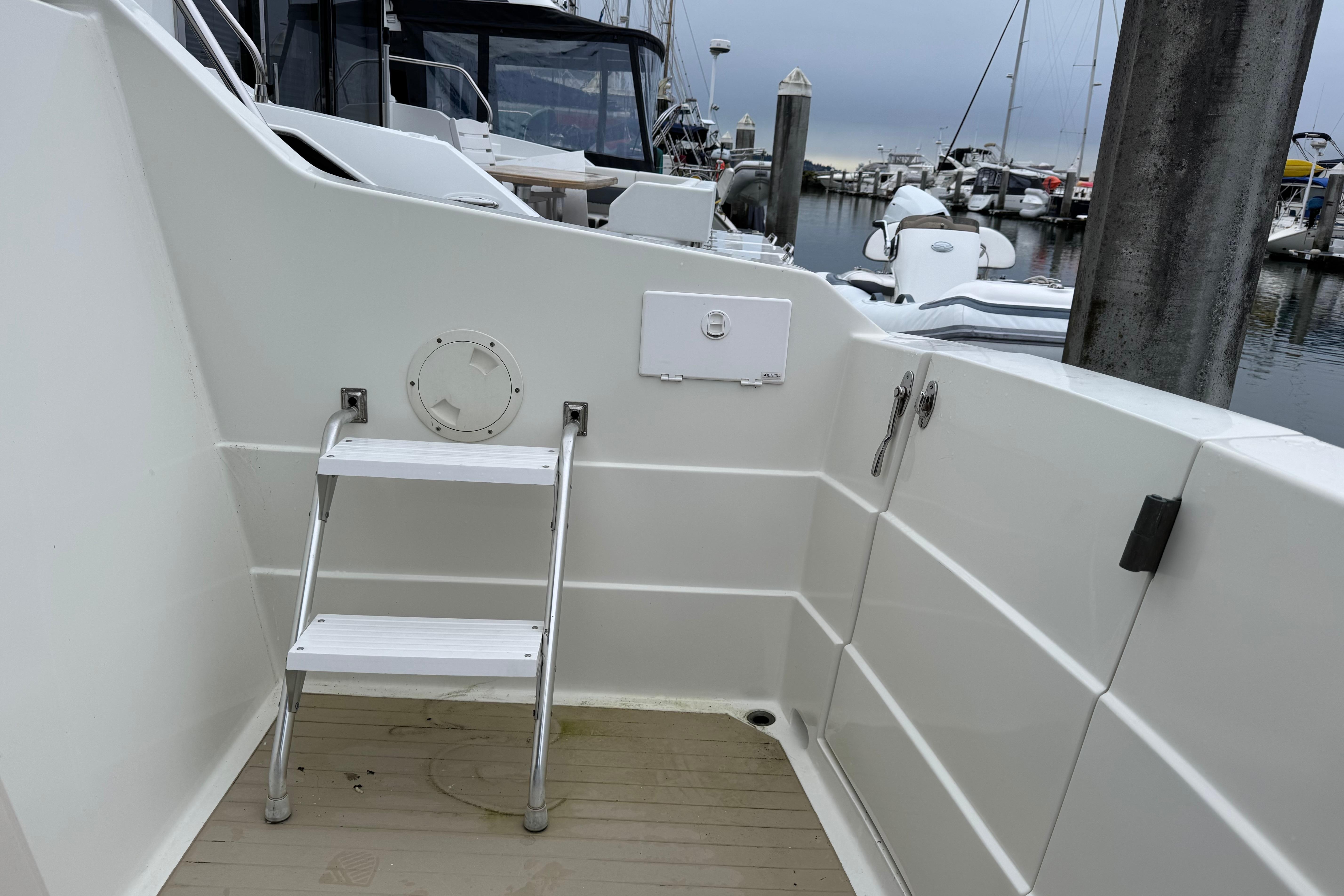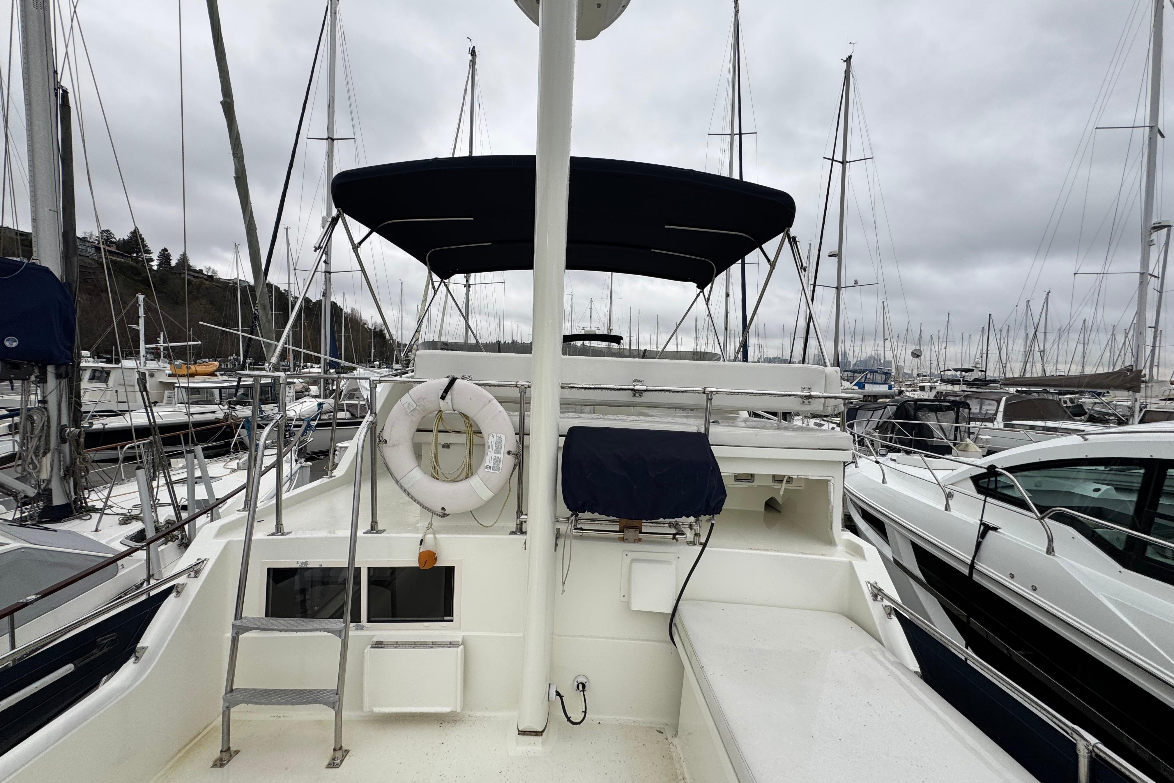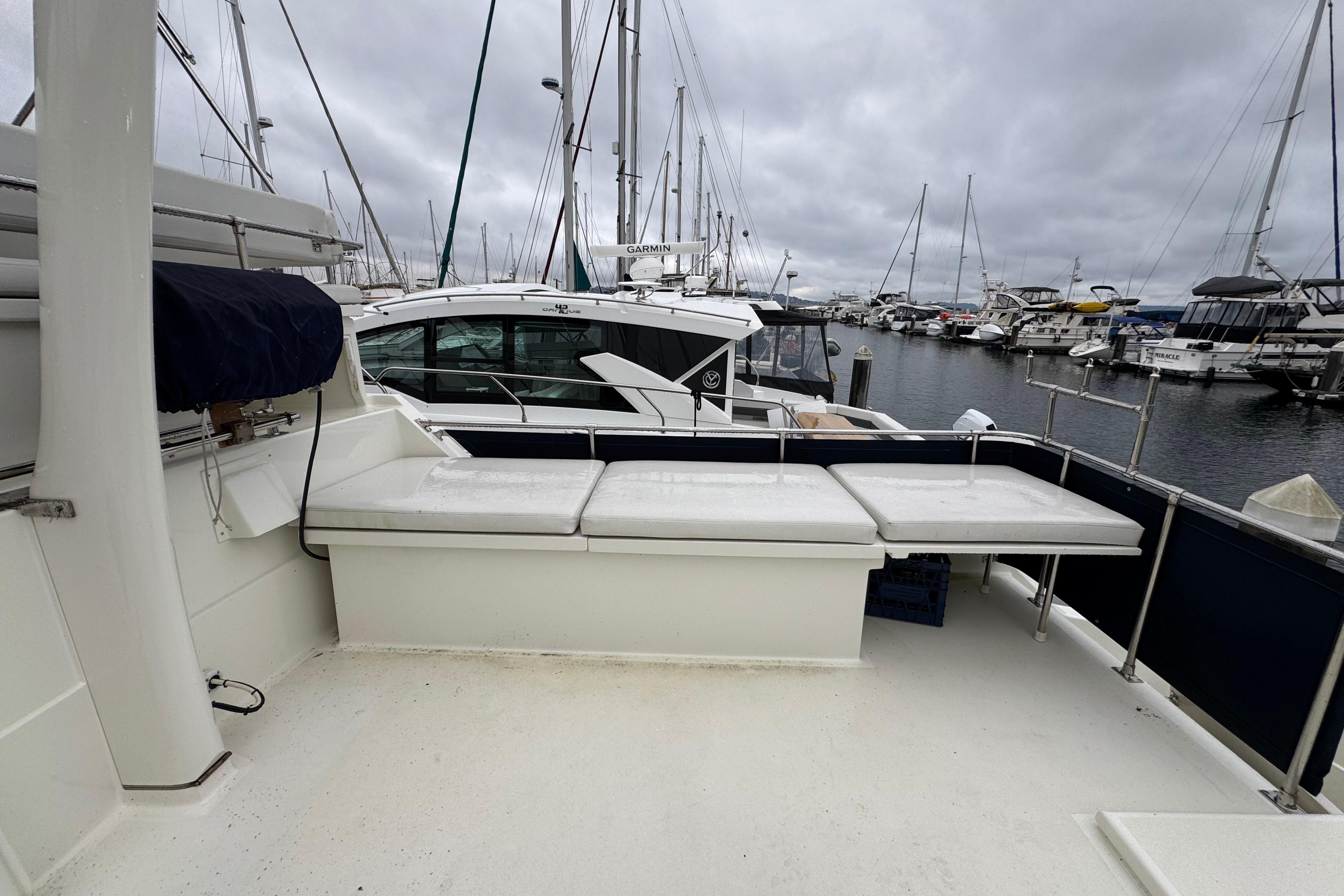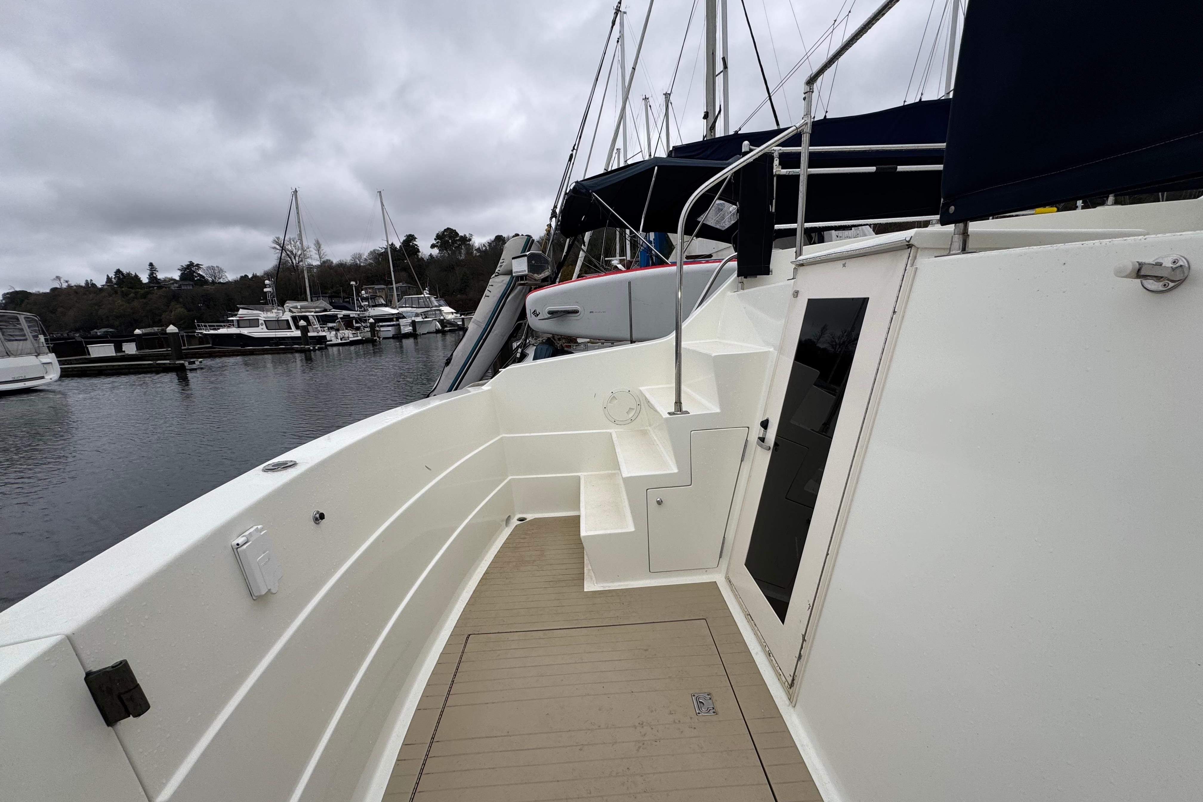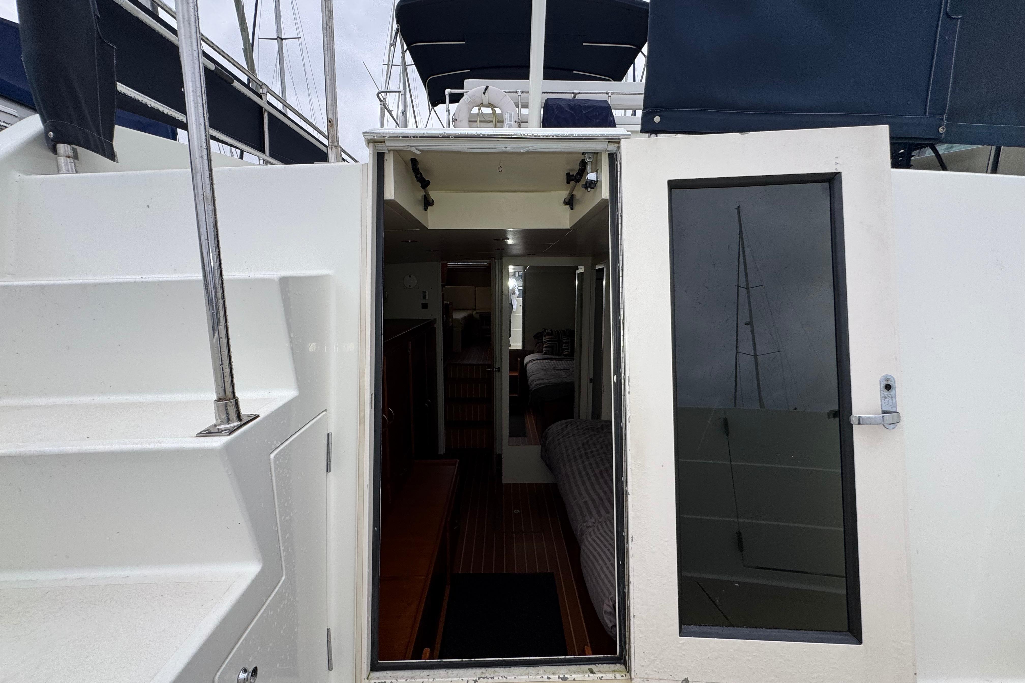 - Owners Stateroom has an offset queen to starboard with aft cockpit and main salon entrance.
