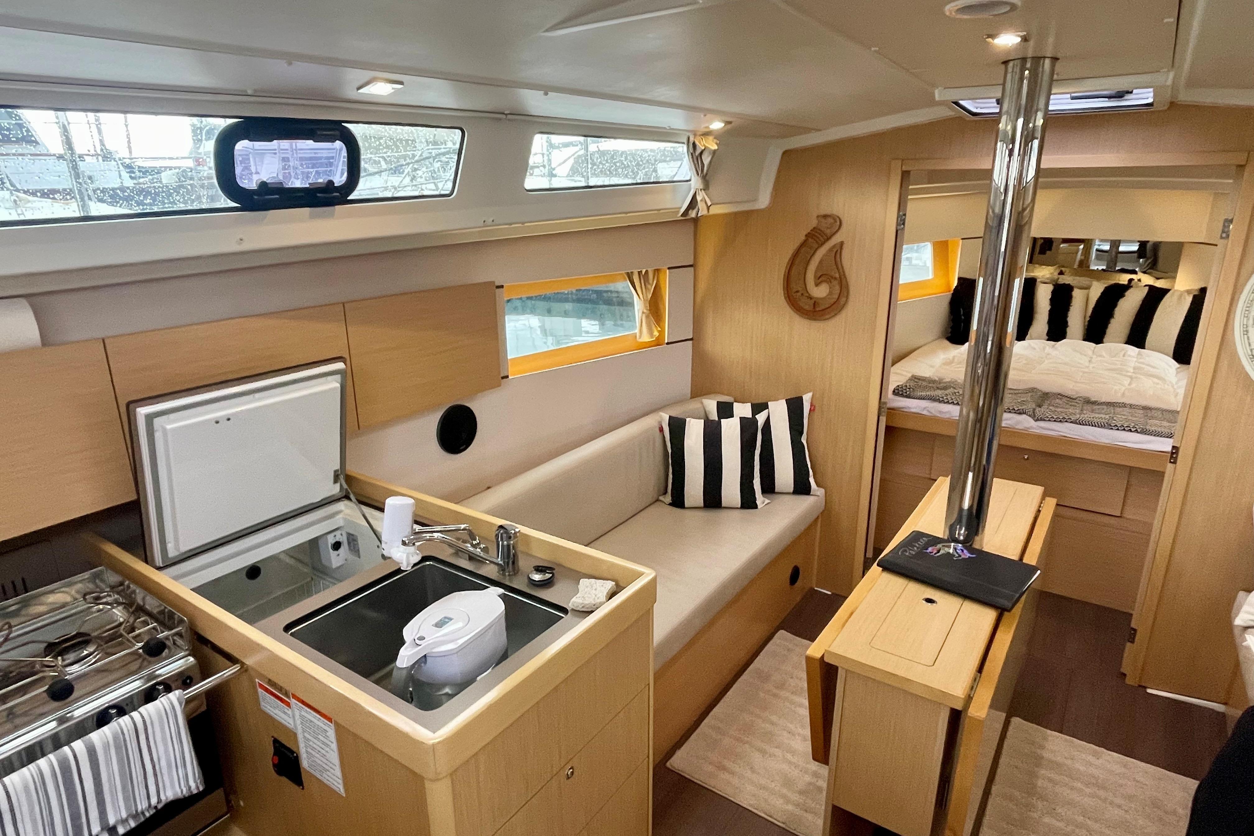 - Main salon has L-shaped settee to port and bench seat to starboard