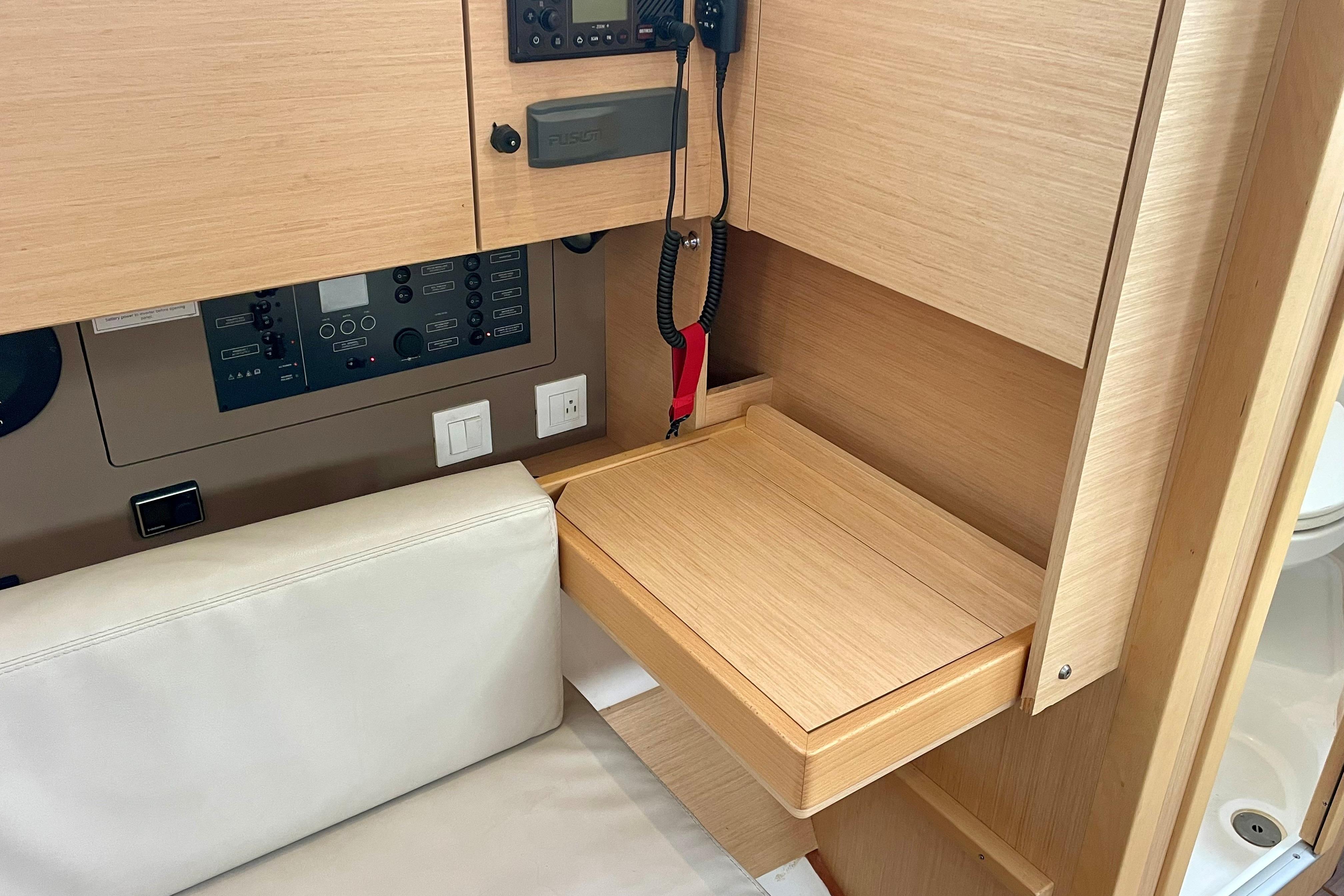 - Hinged helm benches to port or starboard