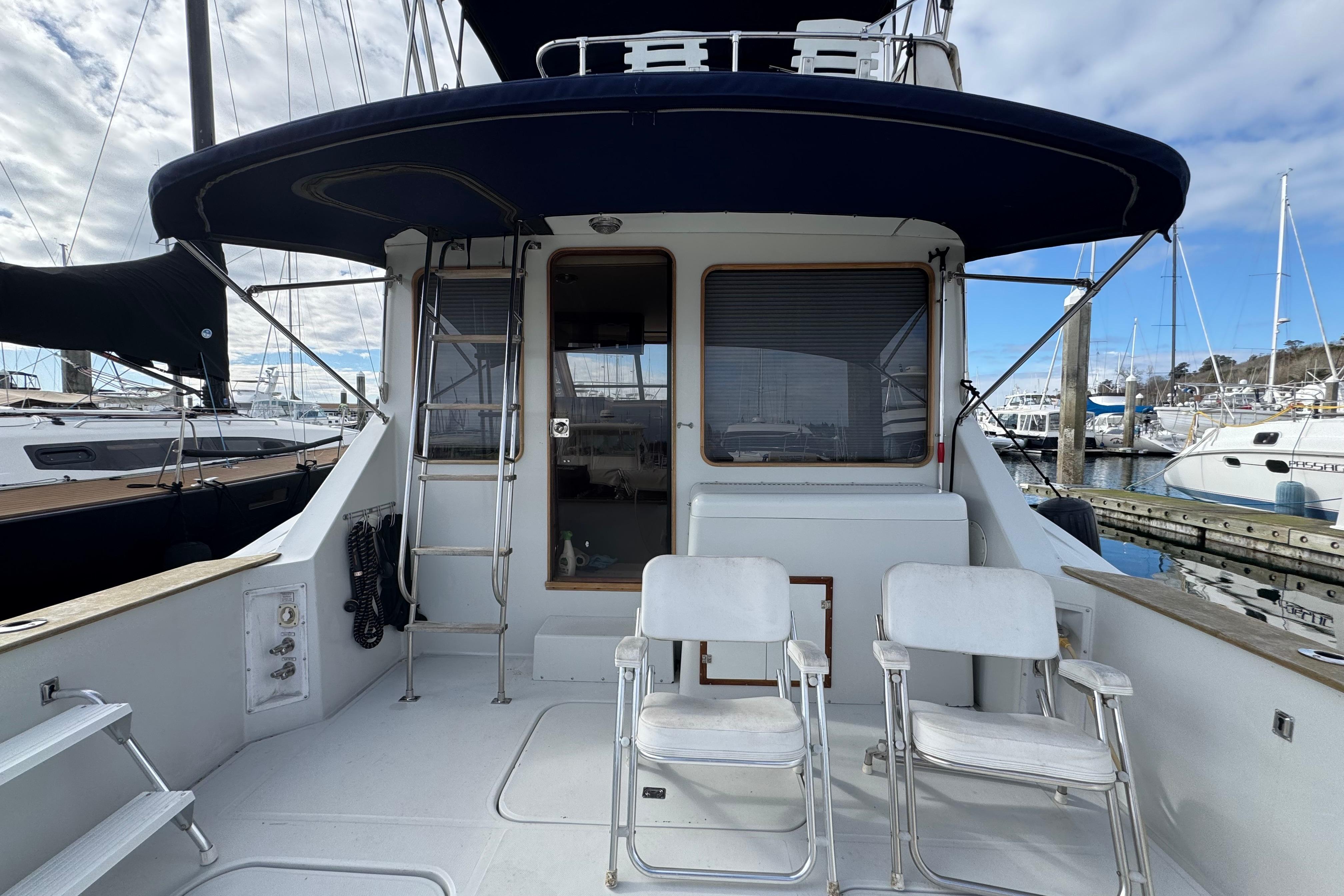 Large partially covered cockpit space with ascending ladder to flybridge.