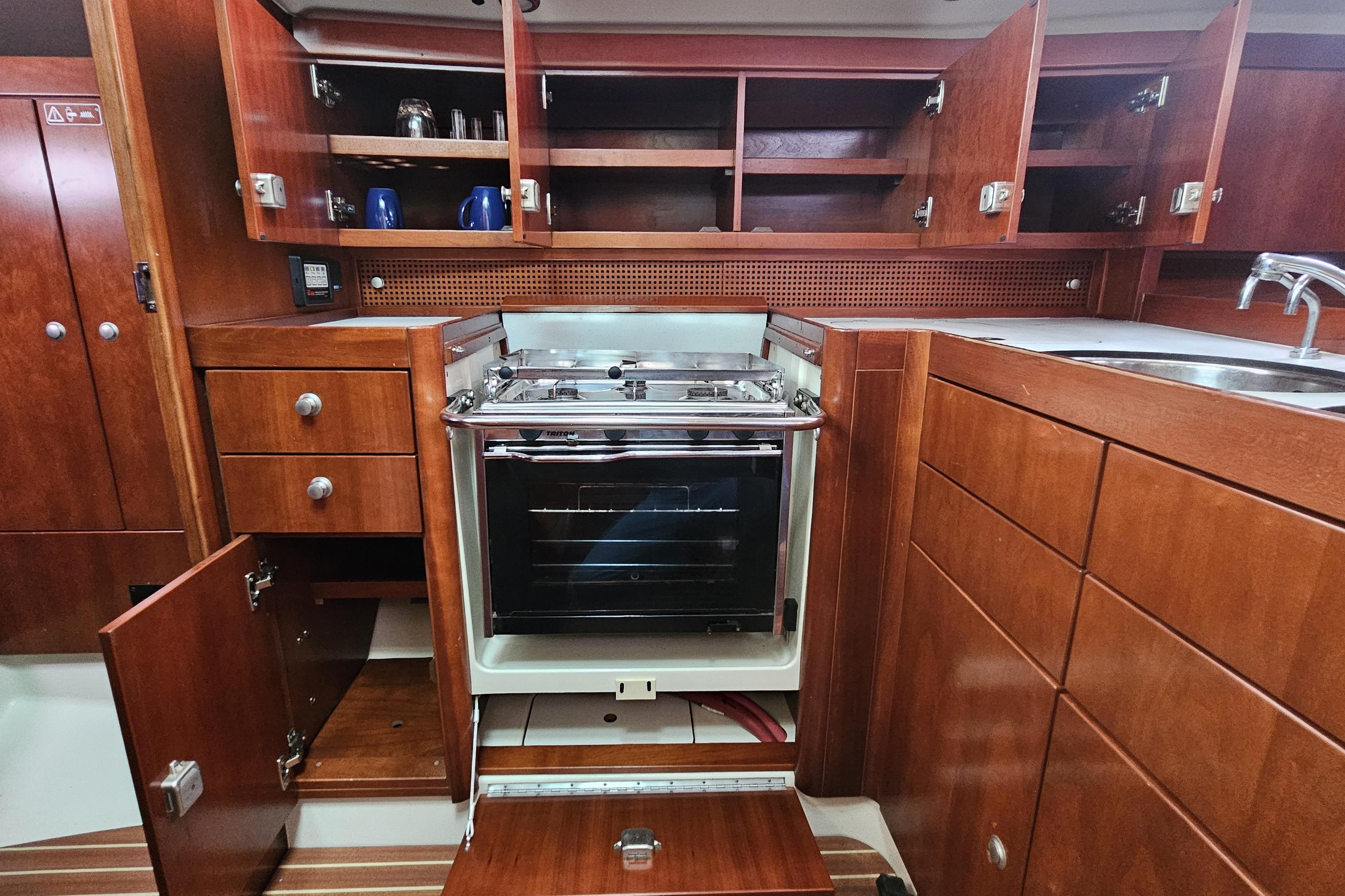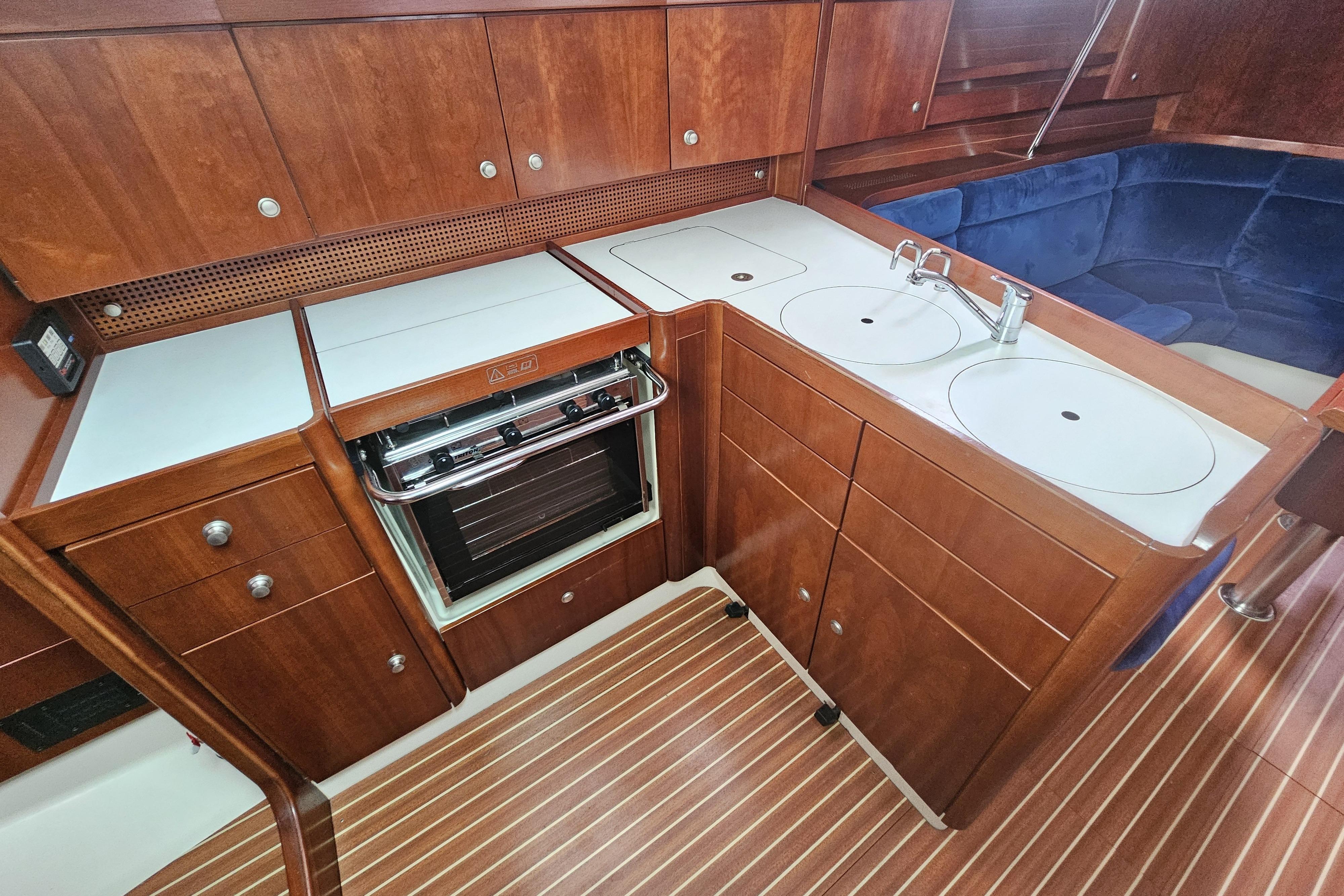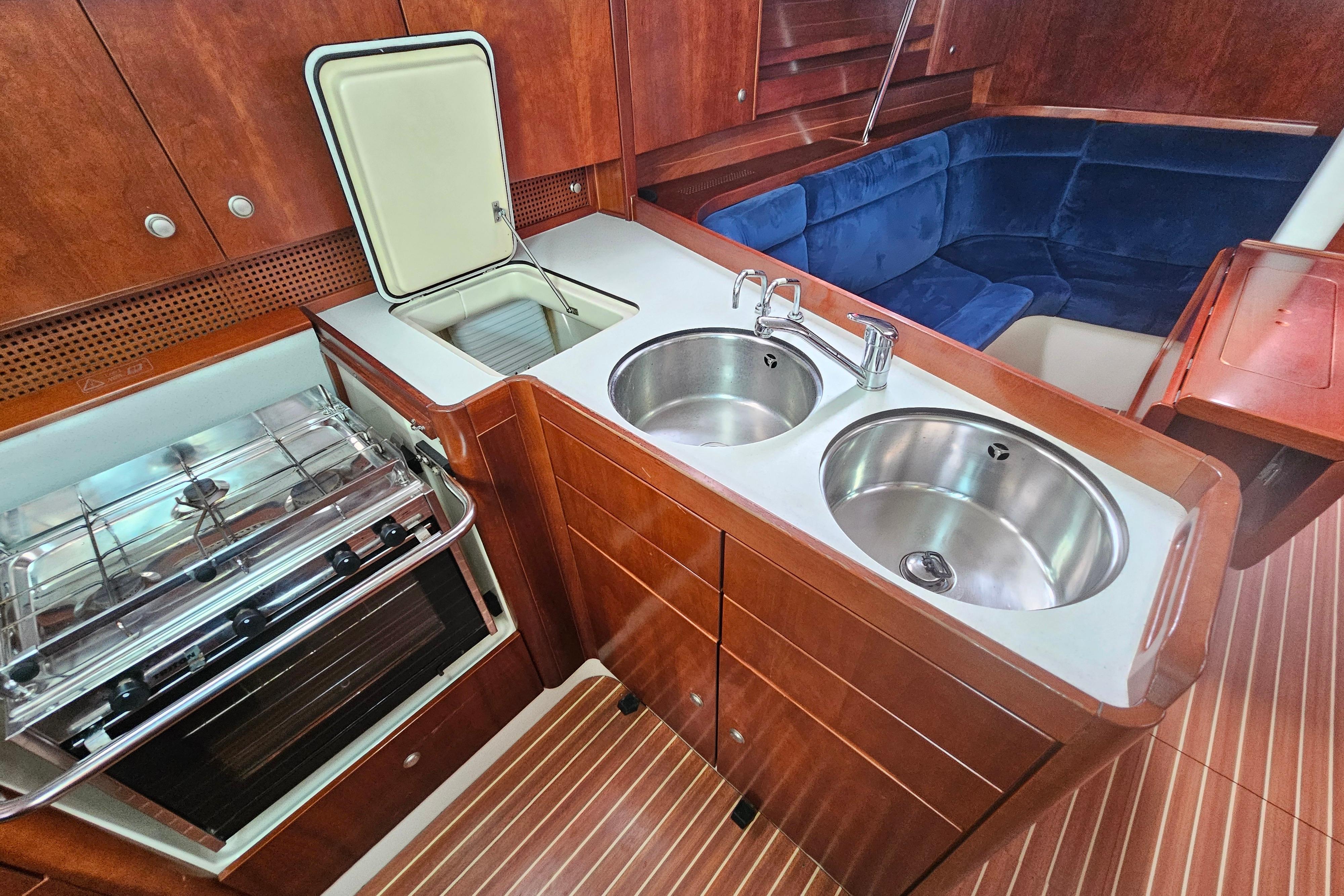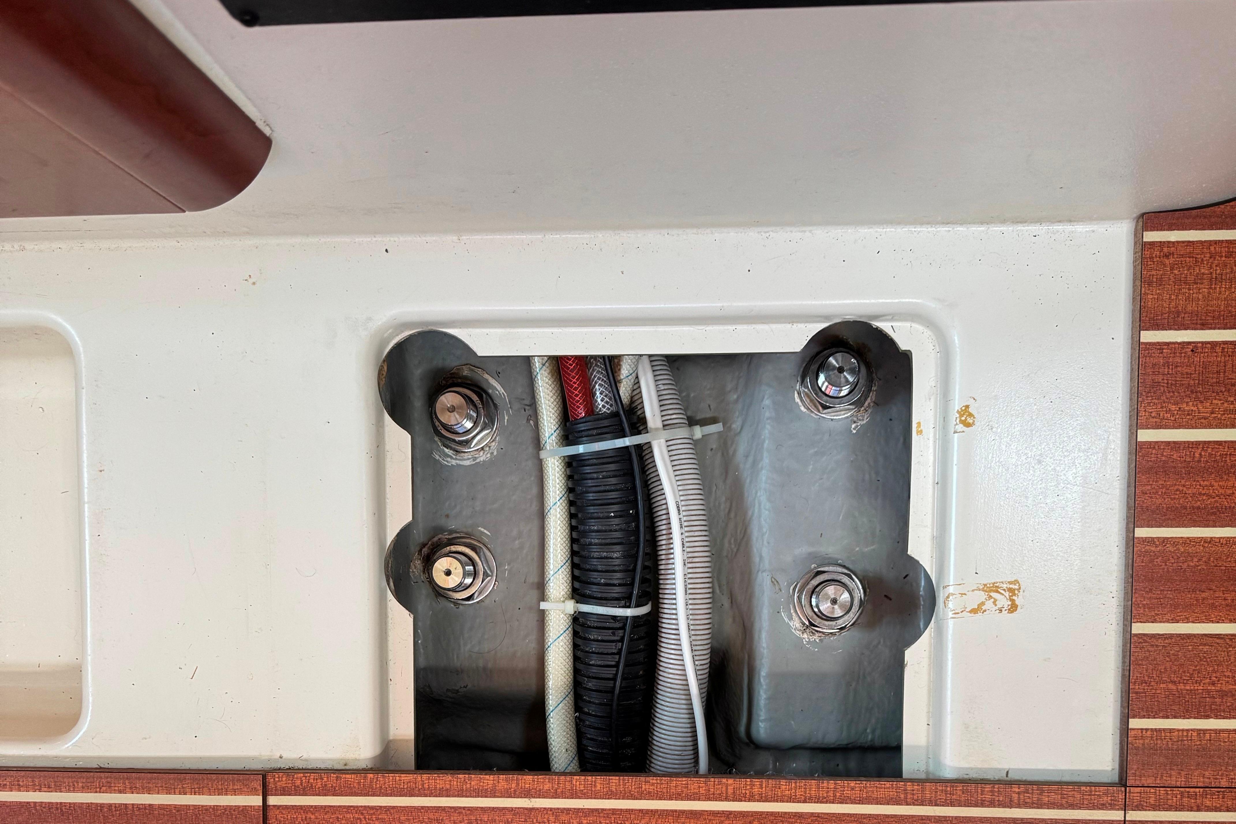 - Fresh water and saltwater auxiliary foot pumps at galley