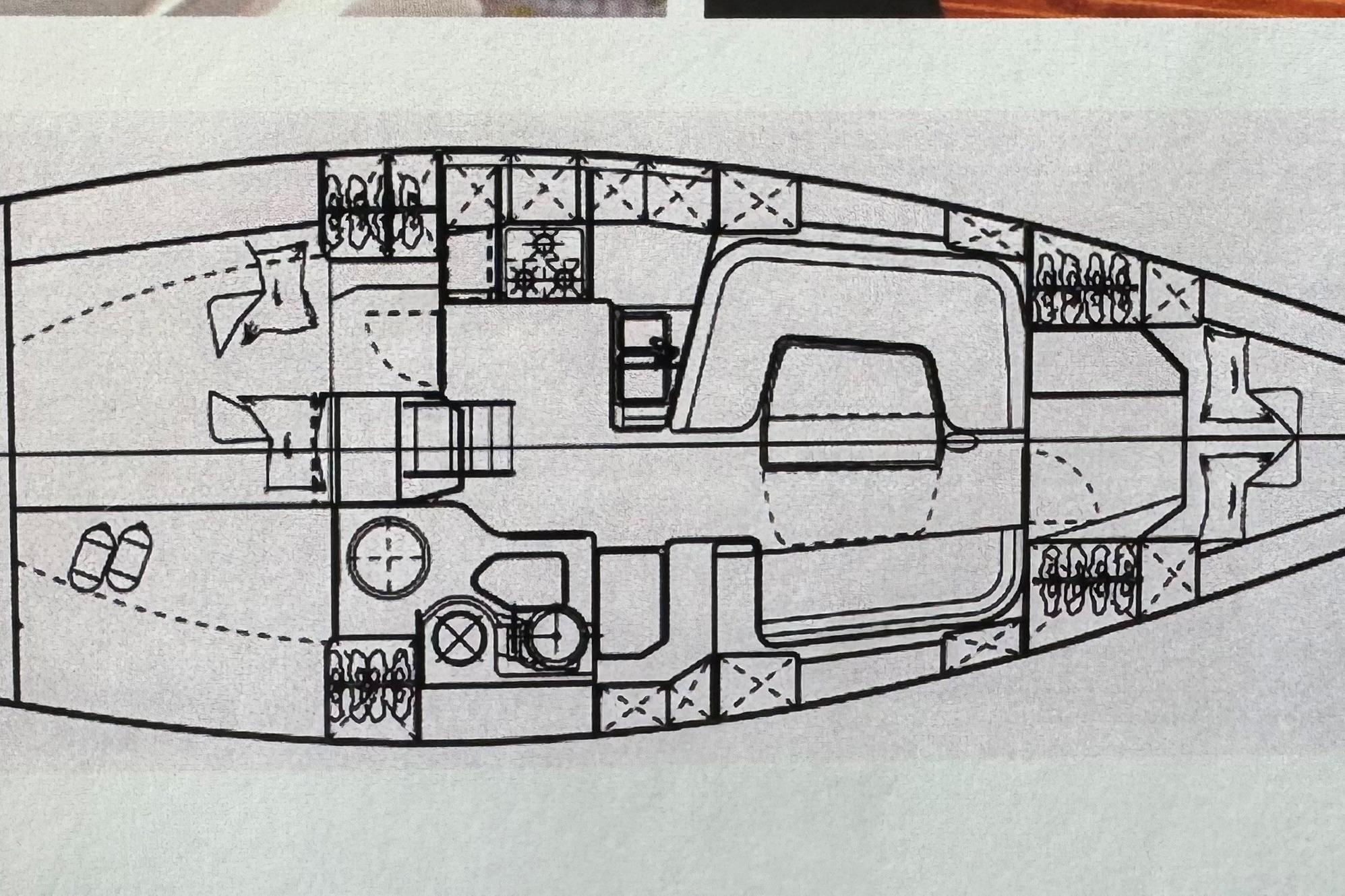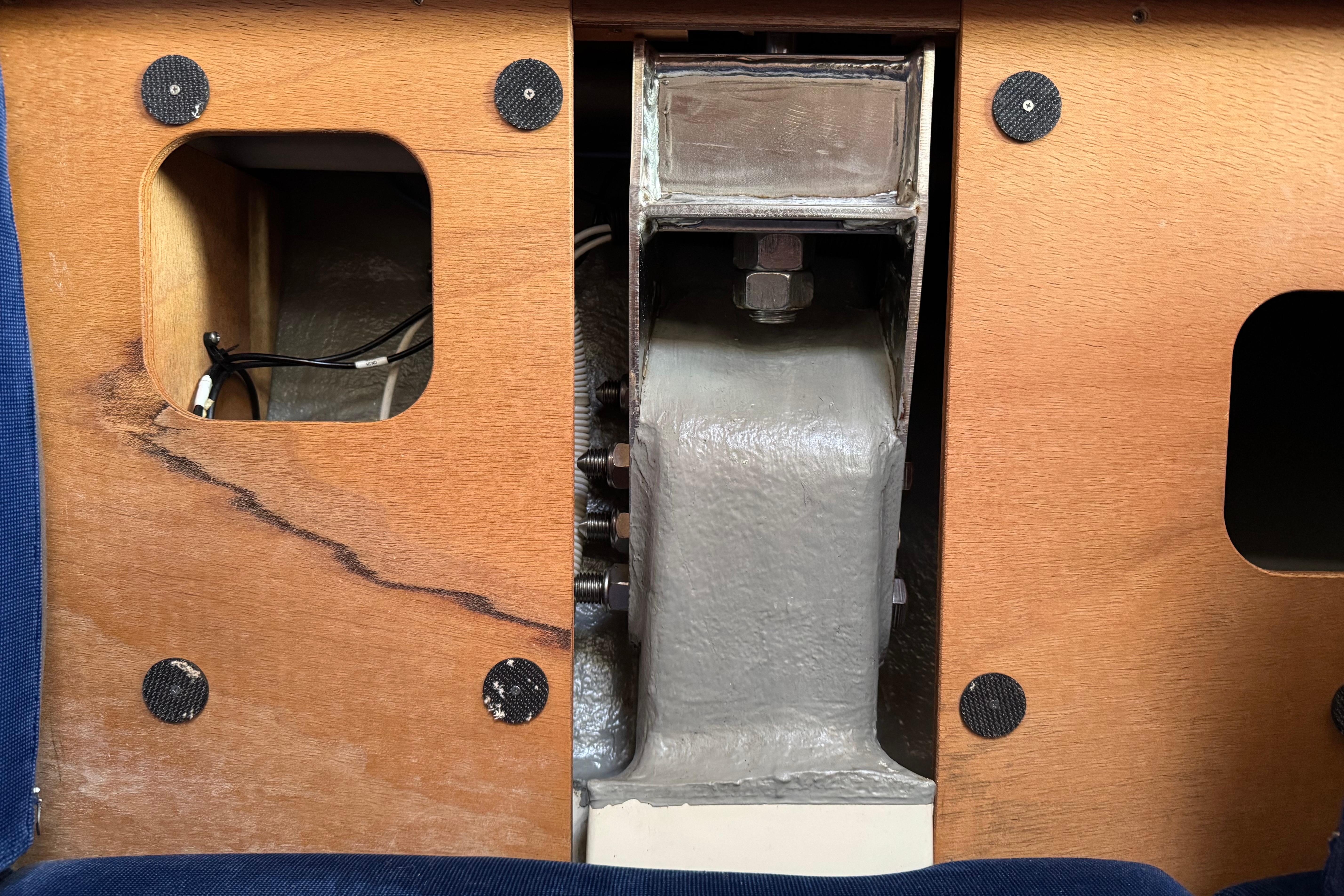 - Heavy duty chain plates through bolted to internal grid with floor beams laminated into the hull distribute keel and rig forces; stainless steel keel bolts integrated to the floor beams