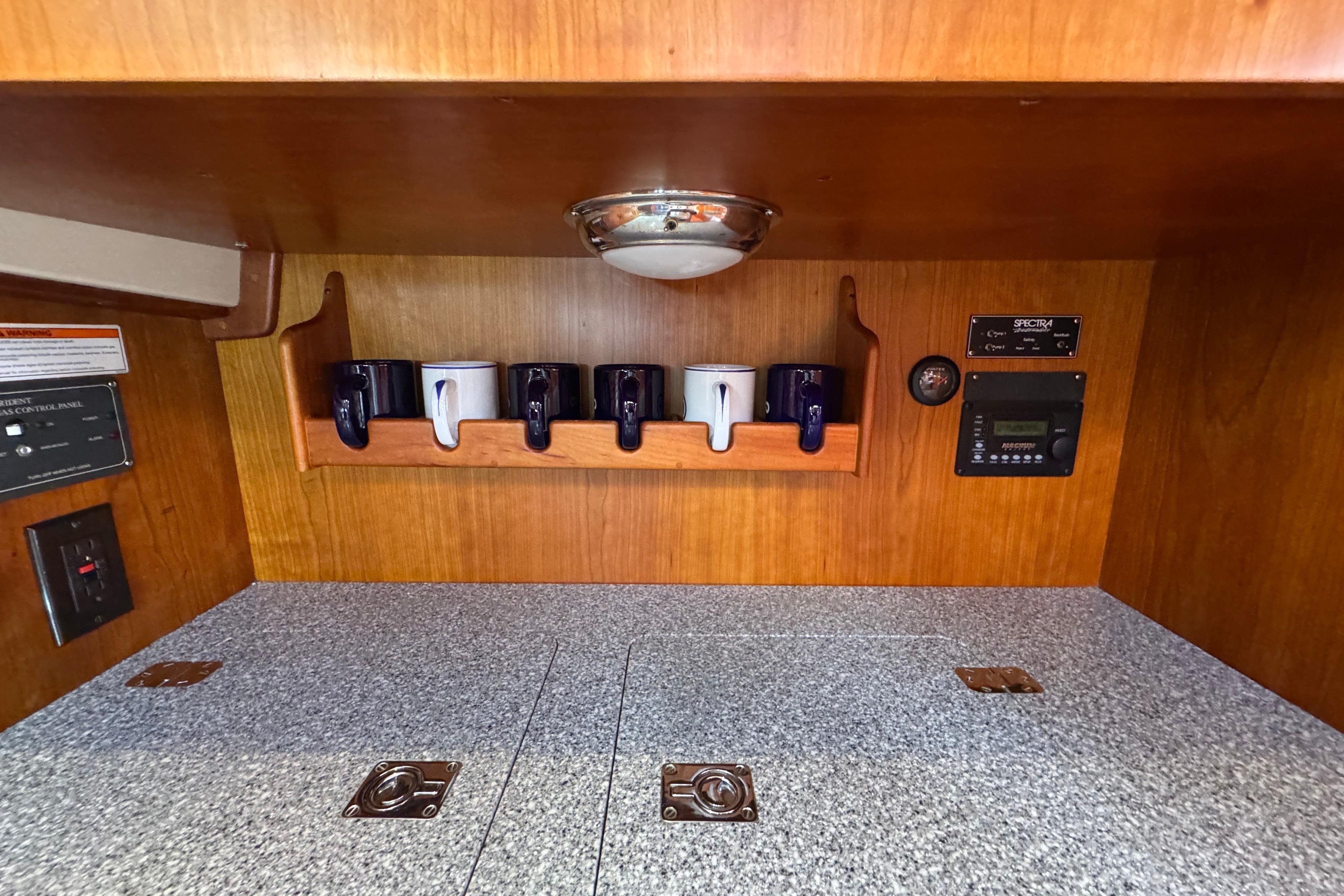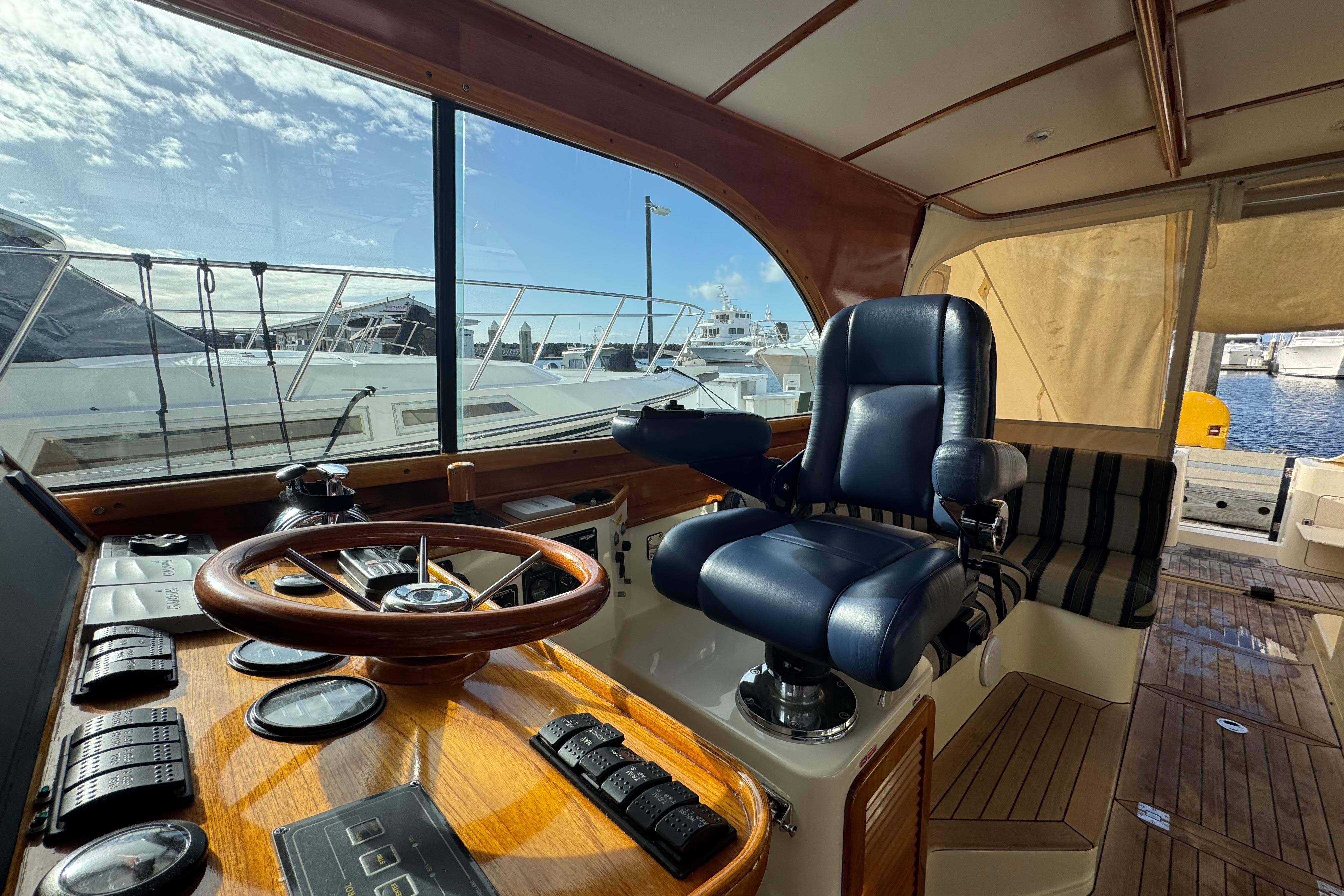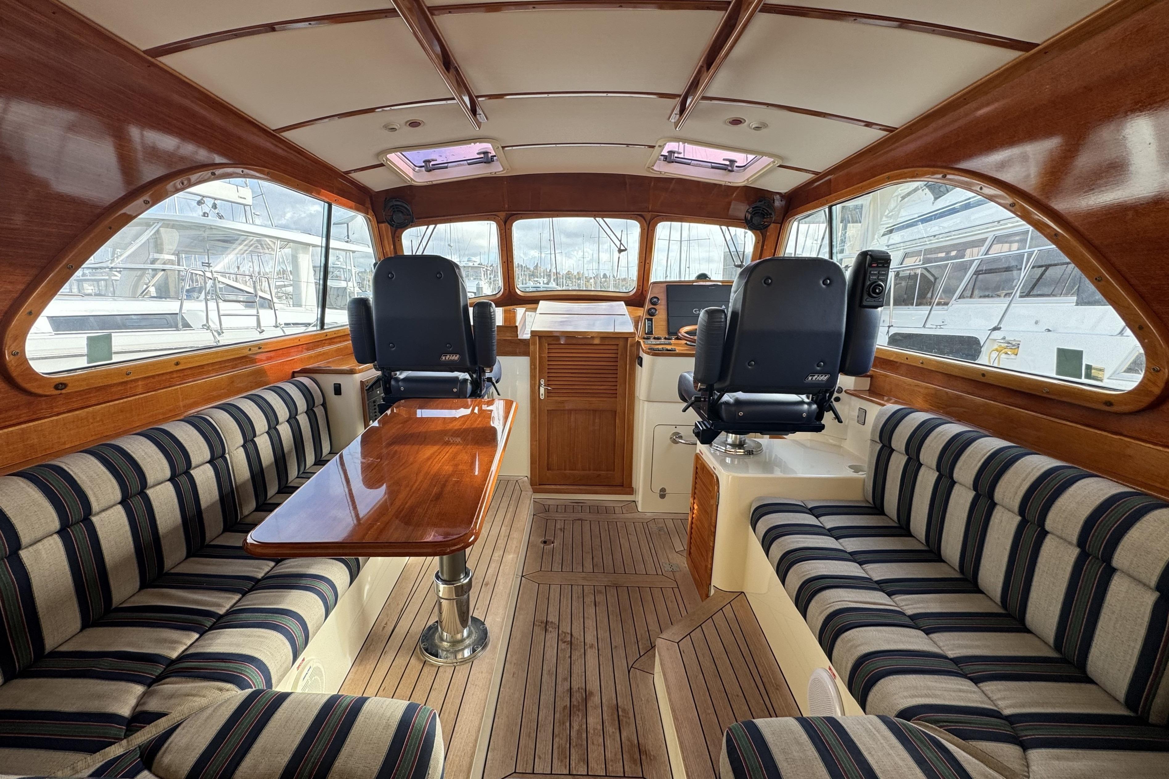 Aft and up the stairs is the spacious semi enclosed pilothouse with exceptional visibility and an inviting settee and table for dining.